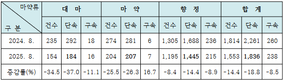 ○ 2025년 8월 마약류사범 단속인원은 1,836명으로 전년 동기(2,261명) 대비 18.8% 감소
