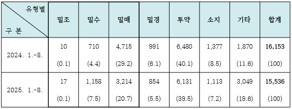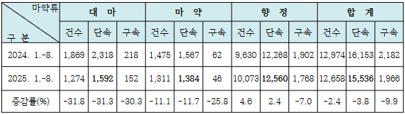 ○ 2025년 8월까지 마약류사범 단속 누계는 총 15,536명으로 전년 동기(16,153명) 대비 3.8% 감소