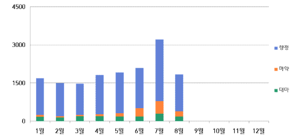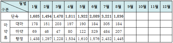 1. 월간 마약류 사범 단속현황(8월) 2. 연간 마약류 사범 단속현황(누계) 3. 월간 마약류 사범 유형벼 단속현황(8월) 4. 연간 마약류 사범 유형별 단속현황(누계) 5. 연령별 단속현황 6. 성별 단속현황 7. 직업별 단속현황