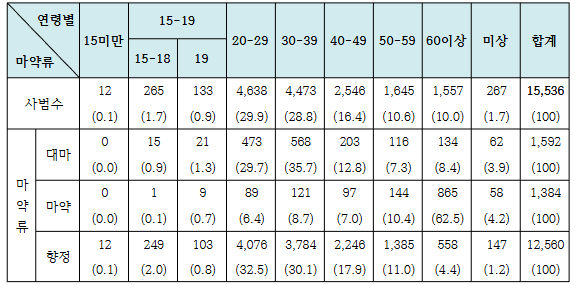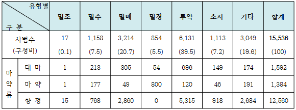 ○ 투약(6,131명, 39.5%) > 밀매(3,214명, 20.7%) > 밀수(1,158명 7.5%) 순