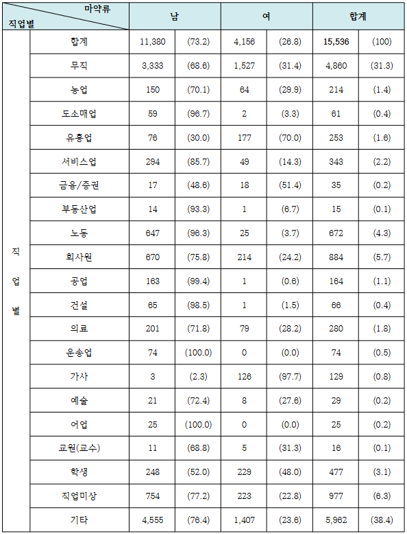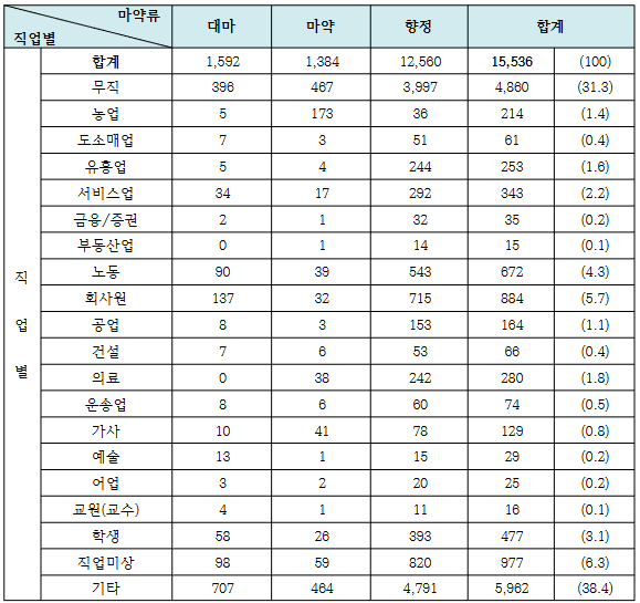 - 무직(4,860명, 31.3%) > 회사원(884명, 5.7%) > 노동(672명, 4.3%) 등