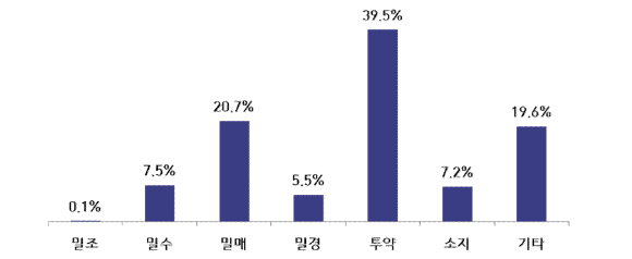 ○ 투약(6,131명, 39.5%) > 밀매(3,214명, 20.7%) > 밀수(1,158명 7.5%) 순