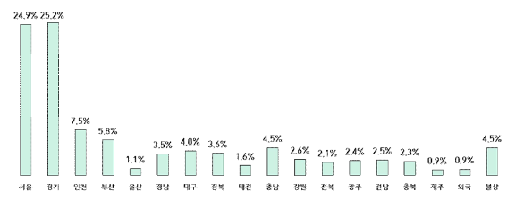 - 경기(3,914명, 25.2%) > 서울(3,872명, 24.9%) > 인천(1,172명, 7.5%) 등