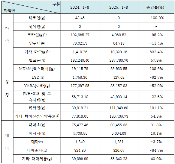 - 2025년 8월까지 외국인 마약류사범은 2,241명으로 전년 동기(2,006명) 대비 11.7% 증가